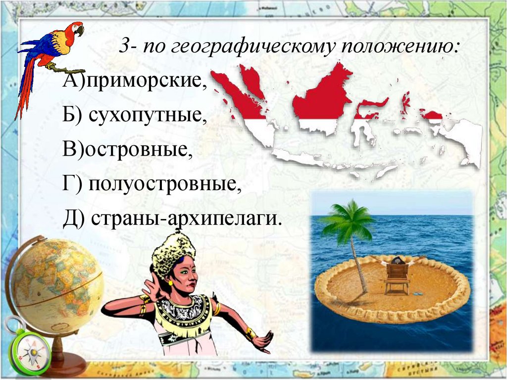 • В) Страны-архипелаги: Япония, Индонезия, Филиппины,