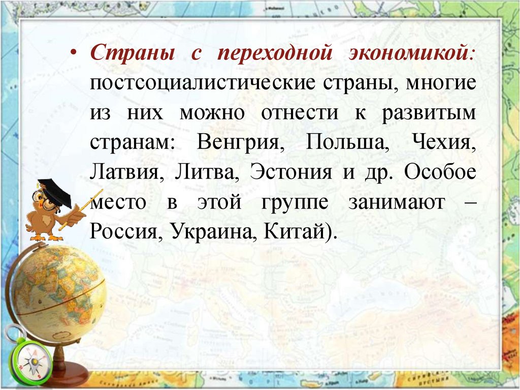 • Страны с переходной экономикой:постсоциалистические страны, многие