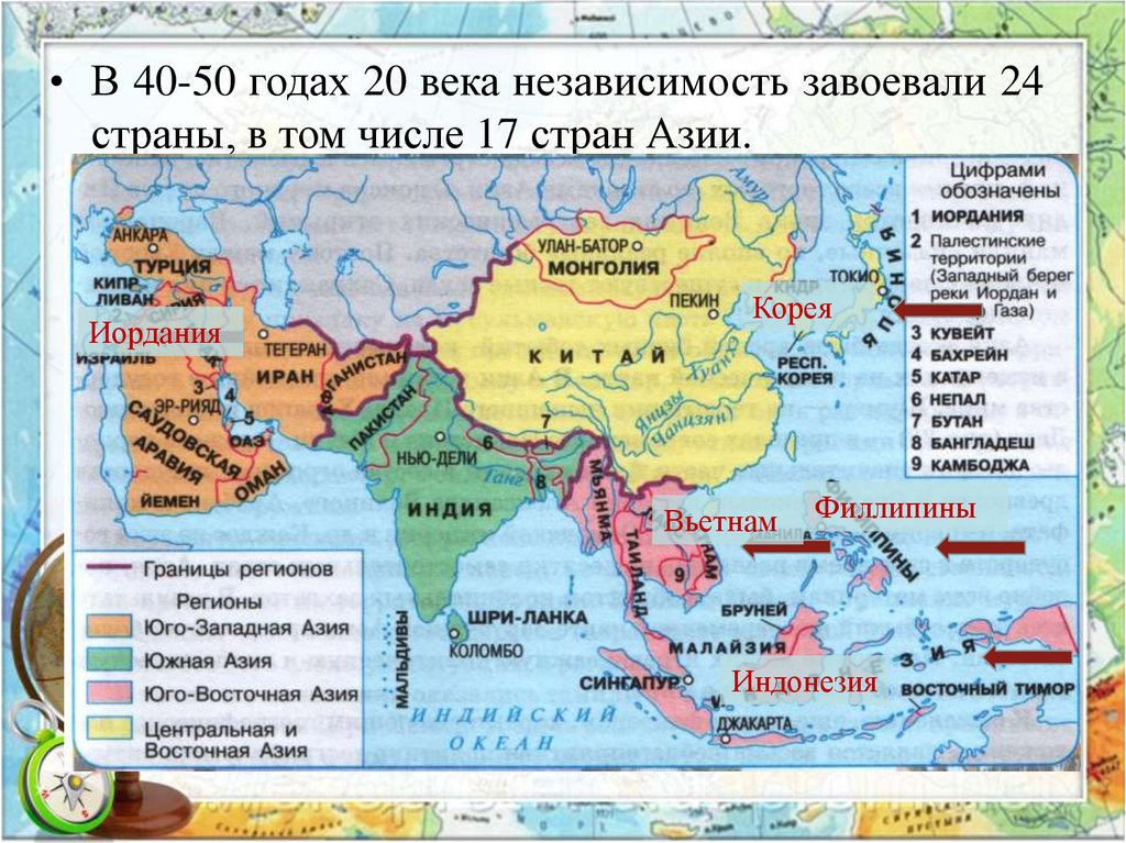 • В 40-50 годах 20 века независимость завоевали 24страны, в том числе 17 стран Азии.