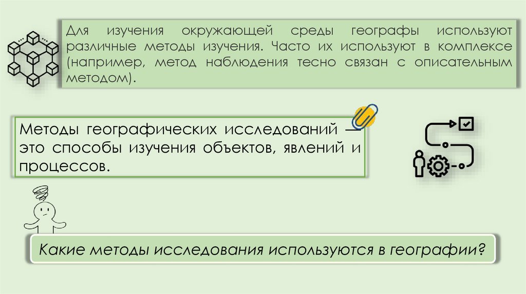 Для изучения окружающей среды географы используютразличные методы изучения. Часто их используют в комплексе
