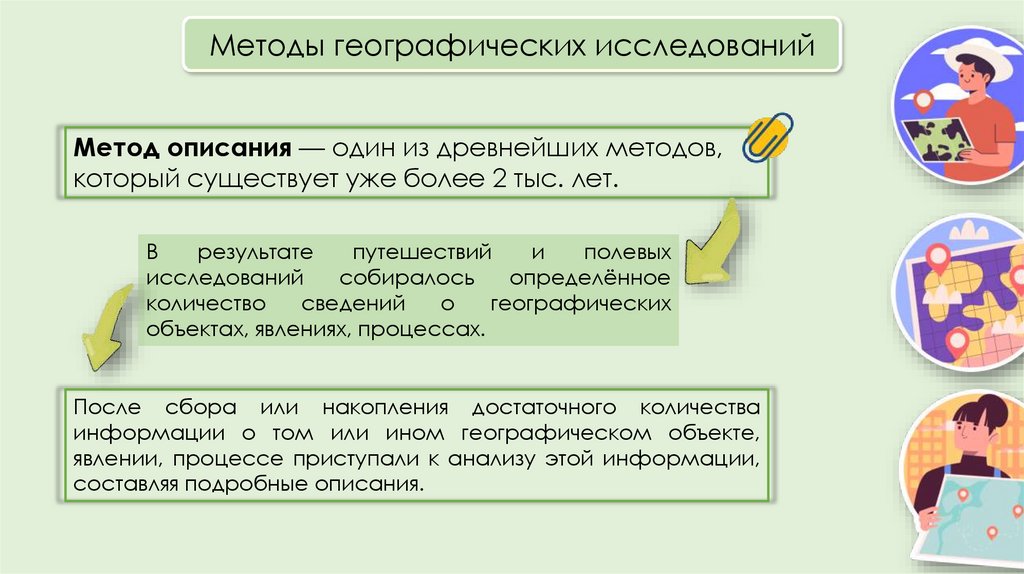 Методы географических исследованийМетод описания — один из древнейших методов,