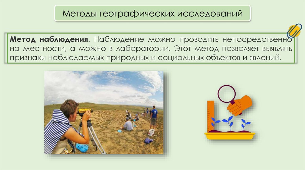 Методы географических исследованийМетод наблюдения. Наблюдение можно проводить непосредственно