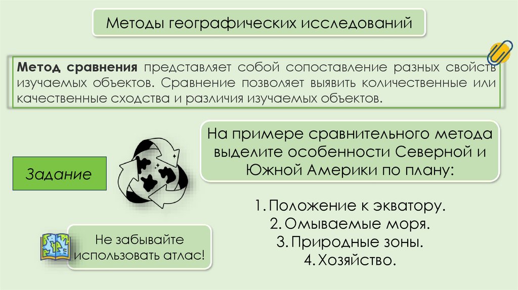 Методы географических исследованийМетод сравнения представляет собой сопоставление разных свойств