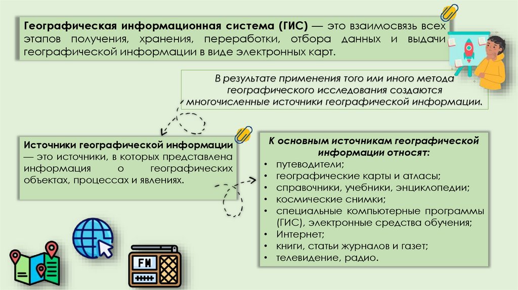 Географическая информационная система (ГИС) — это взаимосвязь всехэтапов получения, хранения, переработки, отбора данных и выдачи