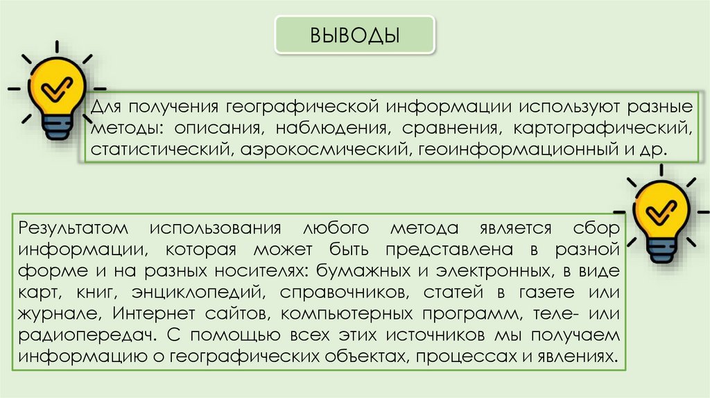 ВЫВОДЫДля получения географической информации используют разные