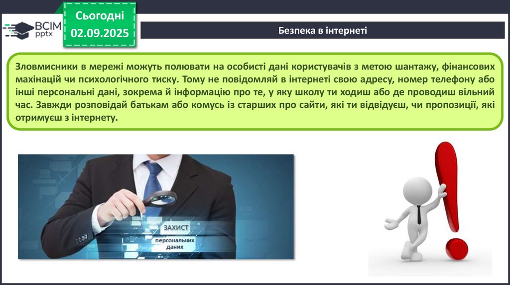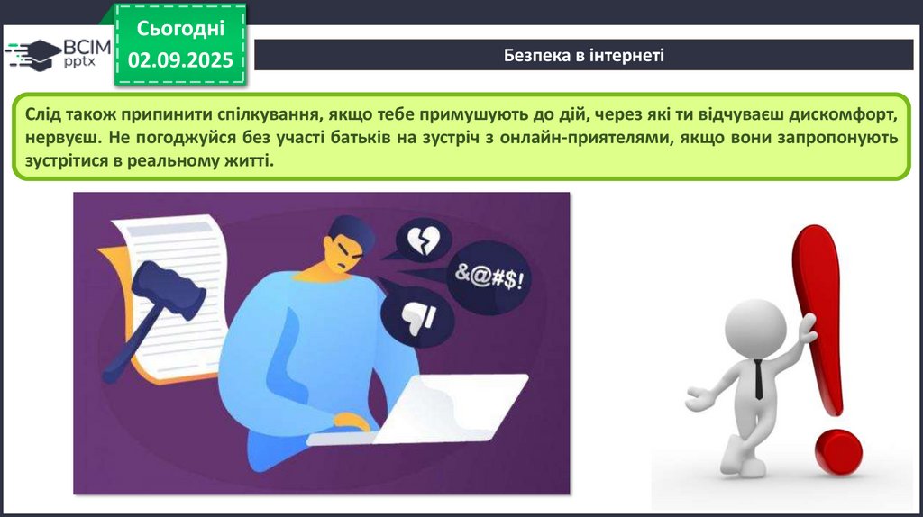 махінацій чи психологічного тиску. Тому не повідомляй в інтернеті свою адресу, номер телефону або