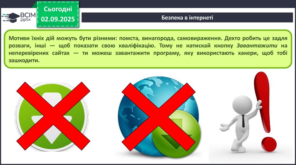 неперевірених сайтах — ти можеш завантажити програму, яку використають хакери, щоб тобі