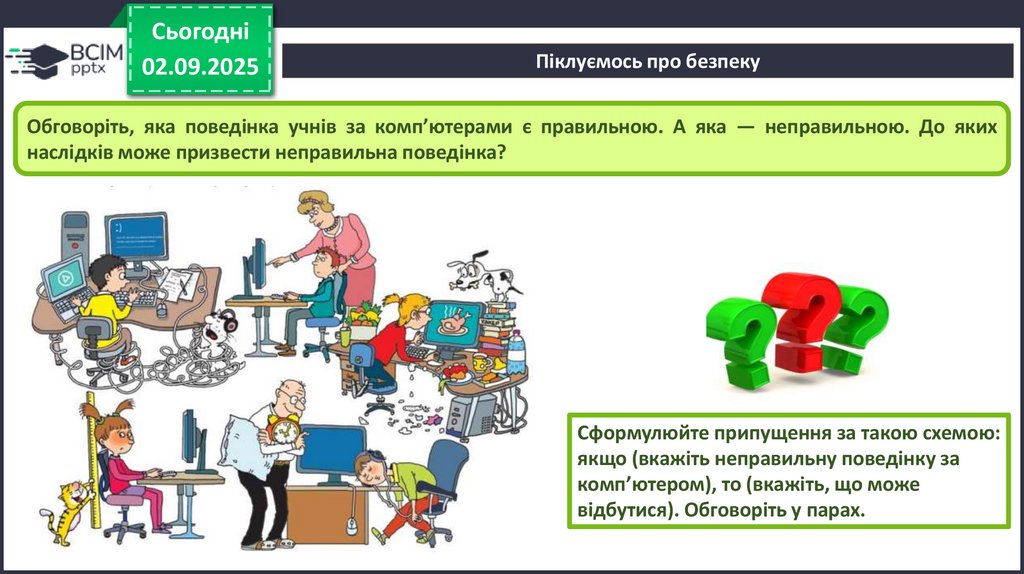 Обговоріть, яка поведінка учнів за комп’ютерами є правильною. А яка — неправильною. До яких