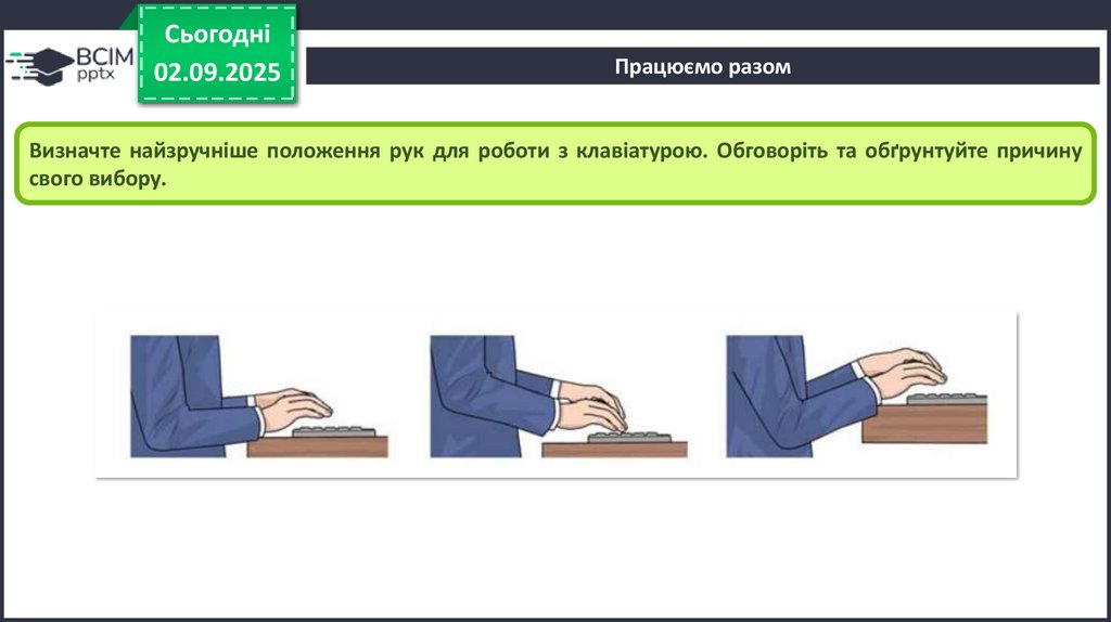 Визначте найзручніше положення рук для роботи з клавіатурою. Обговоріть та обґрунтуйте причину