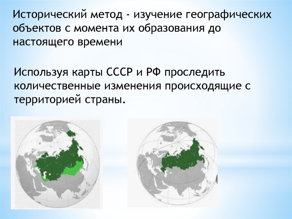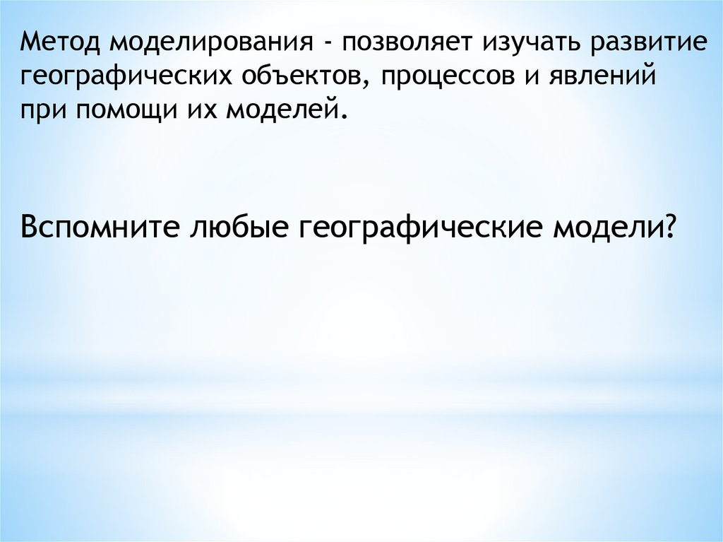 Метод моделирования - позволяет изучать развитиегеографических объектов, процессов и явлений