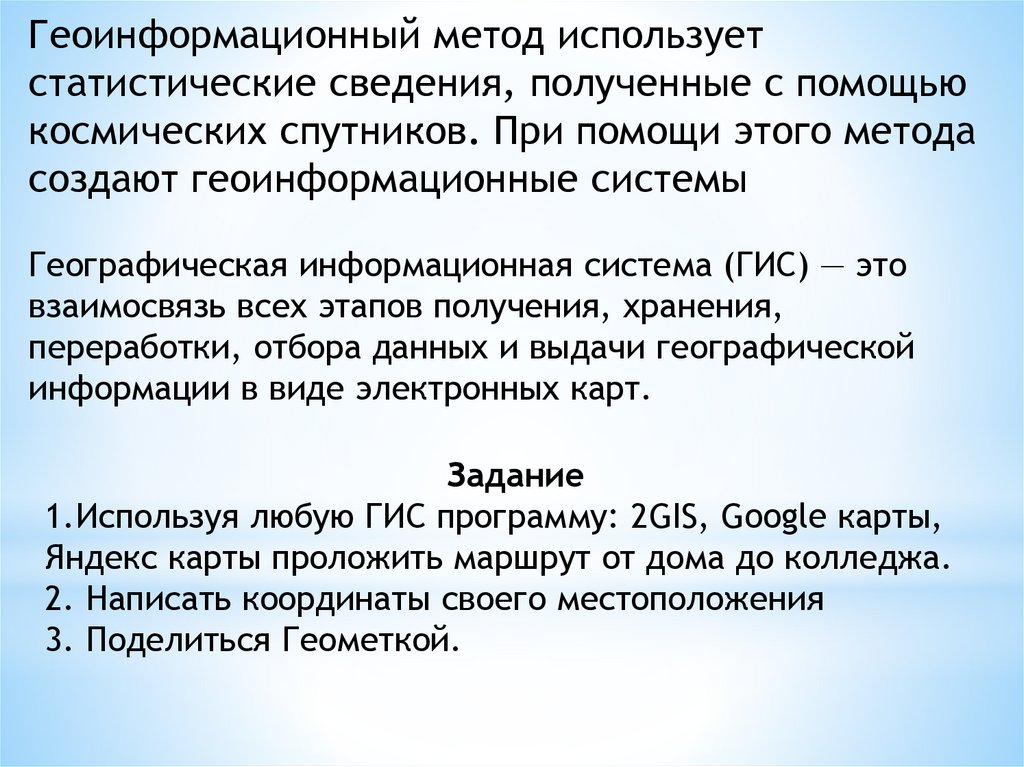 Геоинформационный метод используетстатистические сведения, полученные с помощью