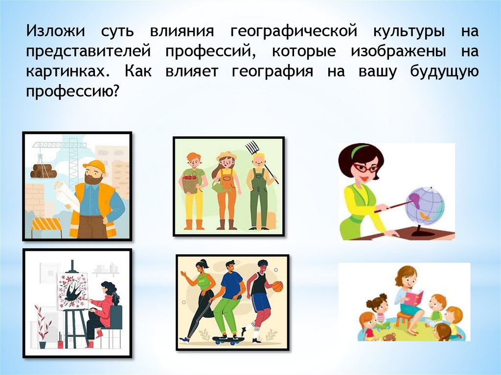 Изложи суть влияния географической культуры напредставителей профессий, которые изображены на
