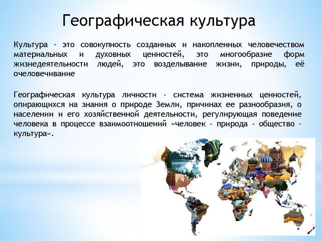 Географическая культураКультура – это совокупность созданных и накопленных человечеством