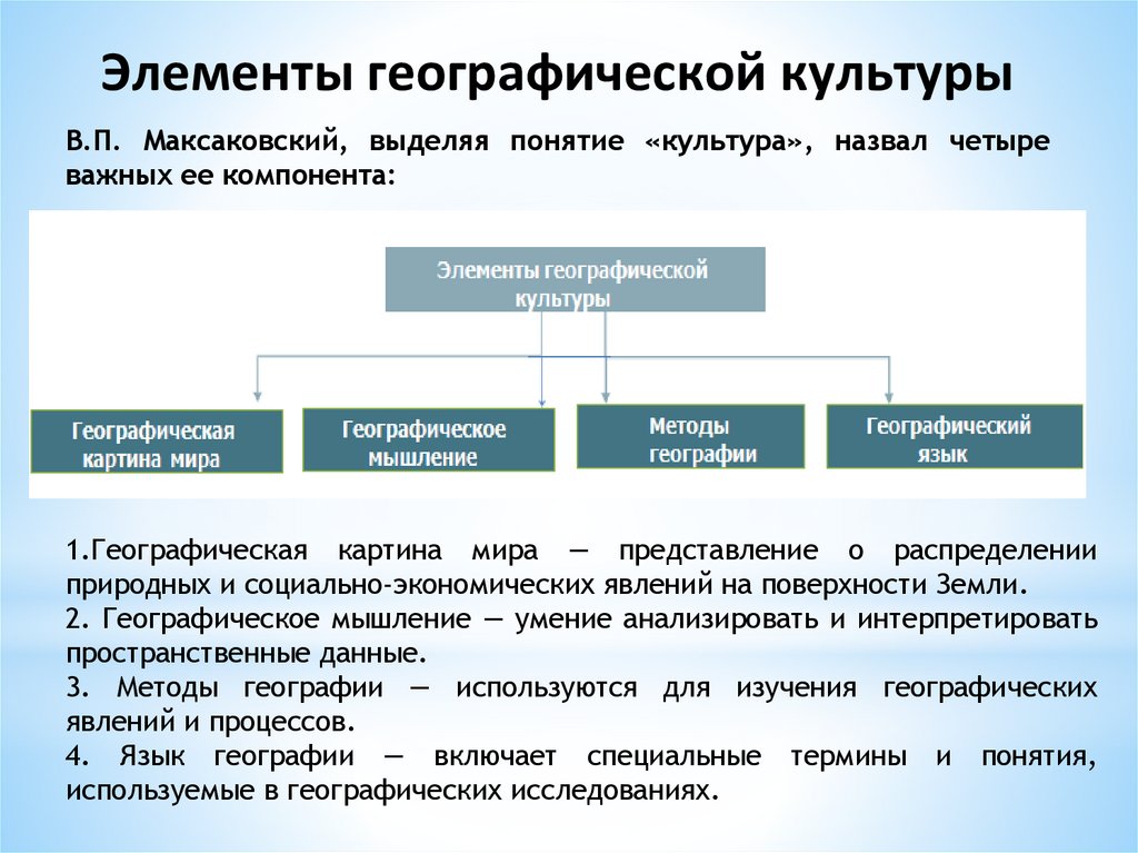 Элементы географической культурыВ.П. Максаковский, выделяя понятие «культура», назвал четыре