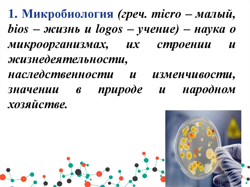 1. Микробиология (греч. micro – малый,bios – жизнь и logos – учение) – наука о