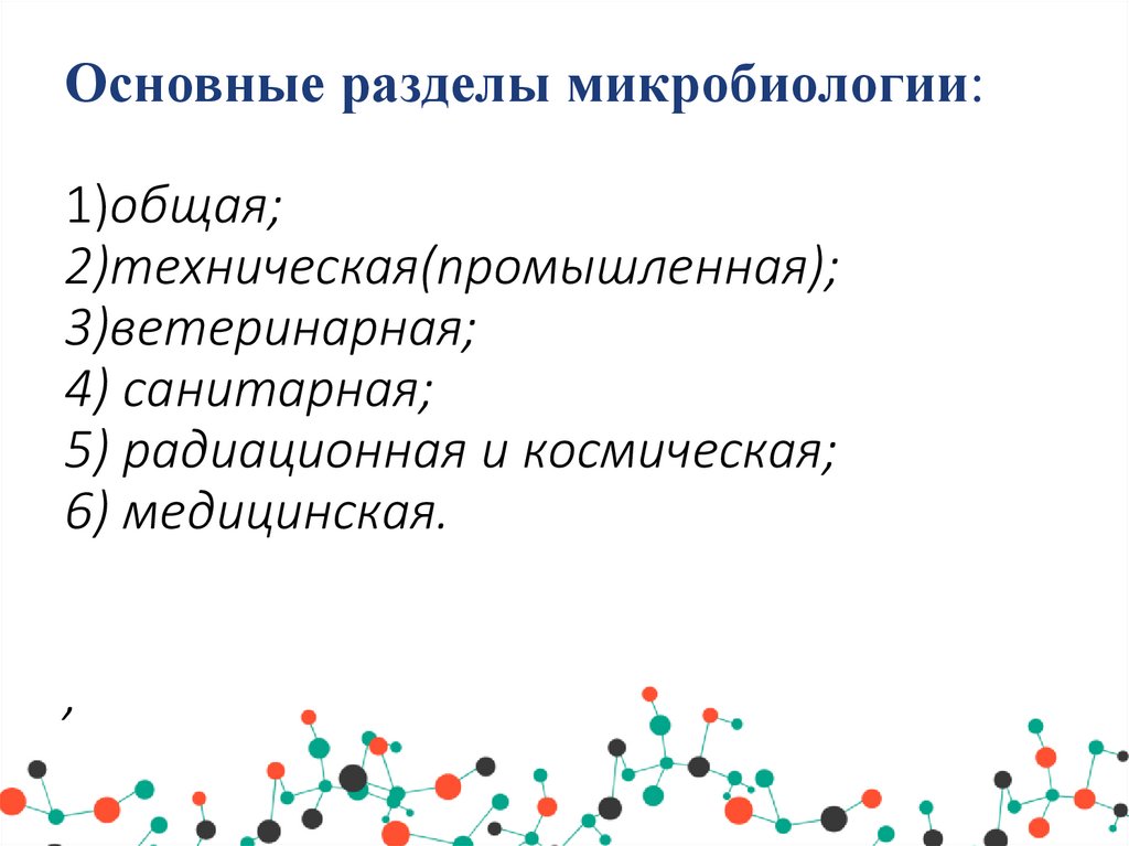 5. Основные разделы микробиологии: 1)общая; 2)техническая(промышленная); 3)ветеринарная; 4) санитарная; 5) радиационная и