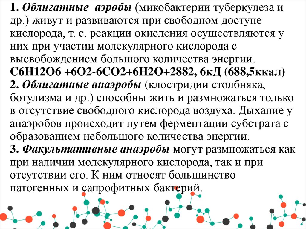 52. 1. Облигатные аэробы (микобактерии туберкулеза и др.) живут и развиваются при свободном доступе кислорода, т. е. реакции