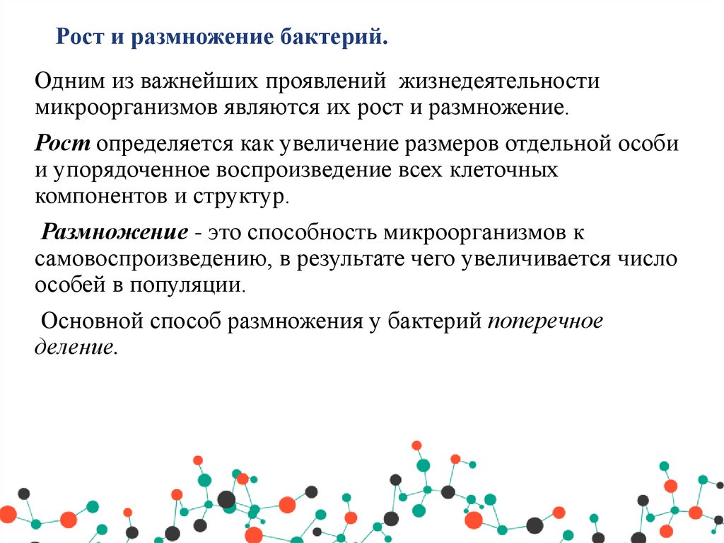 Одним из важнейших проявлений жизнедеятельностимикроорганизмов являются их рост и размножение.