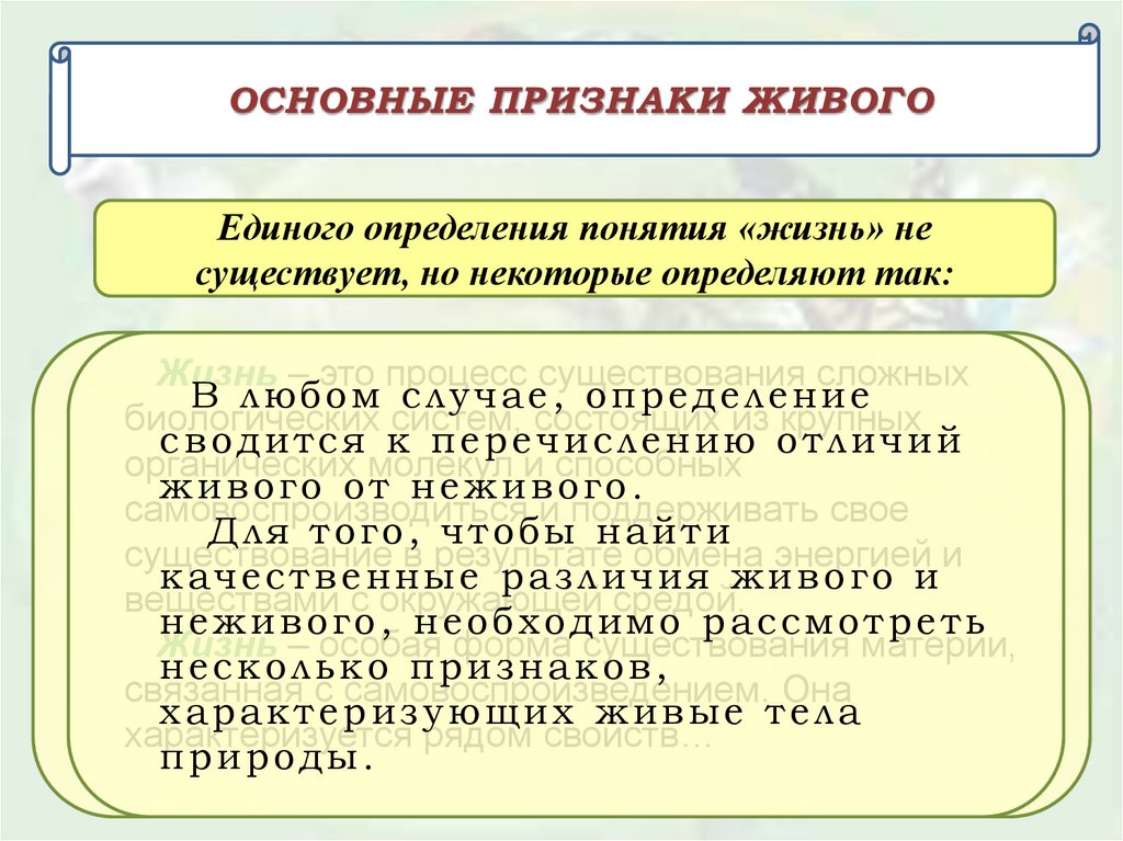 ОСНОВНЫЕ ПРИЗНАКИ ЖИВОГОЕдиного определения