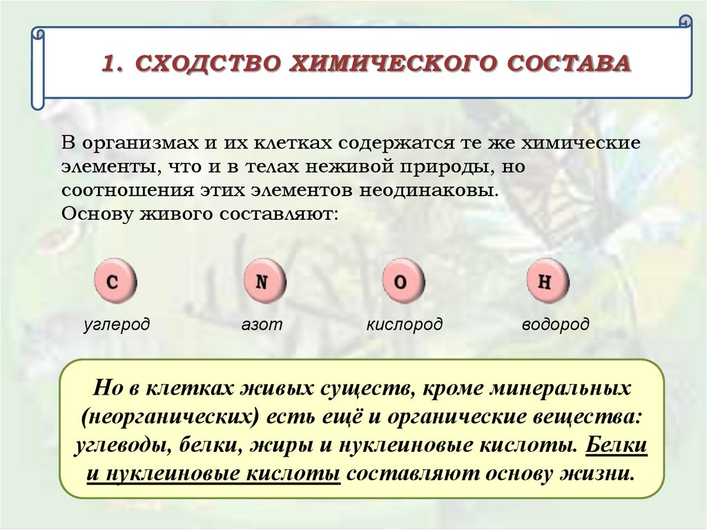 1. СХОДСТВО ХИМИЧЕСКОГО СОСТАВАВ организмах и их клетках содержатся те же химические