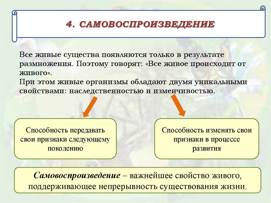 4. САМОВОСПРОИЗВЕДЕНИЕВсе живые существа появляются только в результате