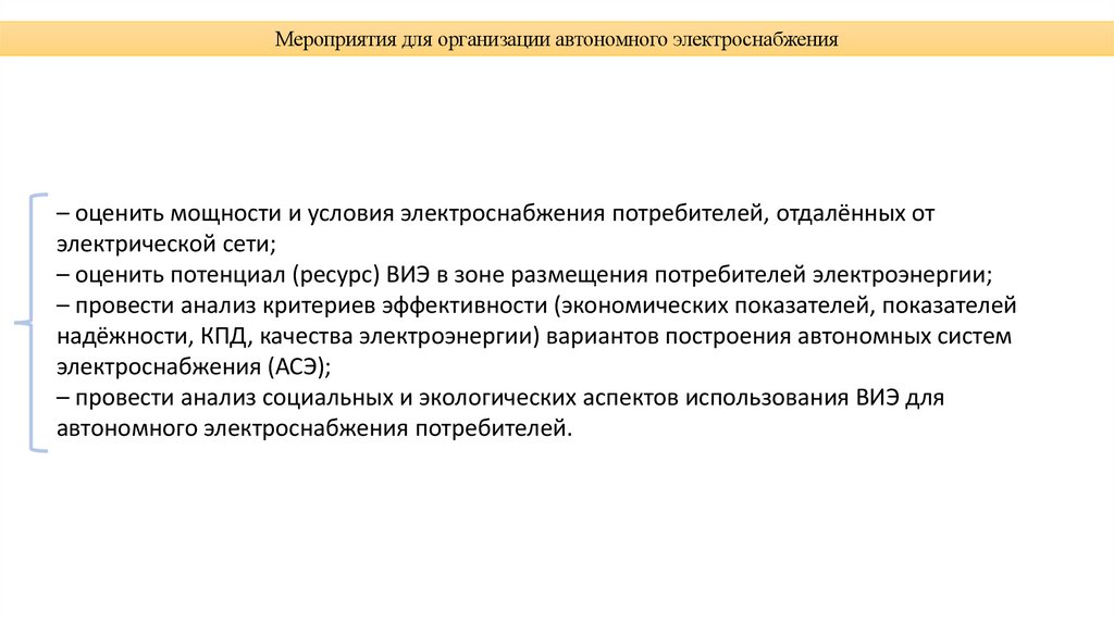 Мероприятия для организации автономного электроснабжения– оценить мощности и условия электроснабжения потребителей, отдалённых от