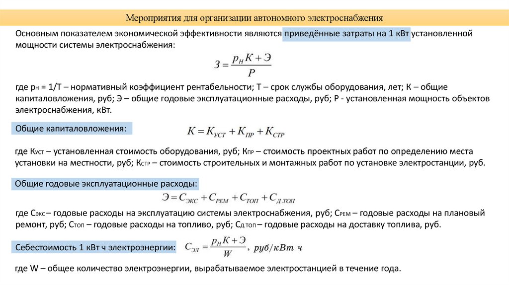 Мероприятия для организации автономного электроснабженияОсновным показателем экономической эффективности являются приведённые затраты на 1 кВт установленной