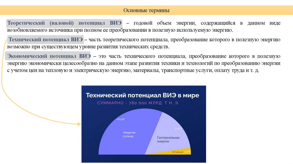 Основные терминыТеоретический (валовой) потенциал ВИЭ – годовой объем энергии, содержащийся в данном виде