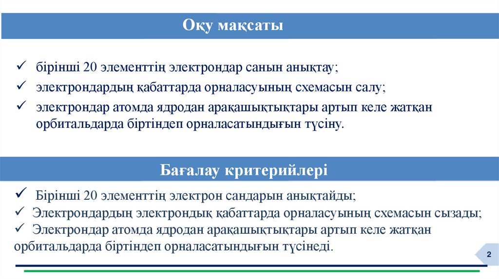 Оқу мақсатыбірінші 20 элементтің электрондар санын анықтау;