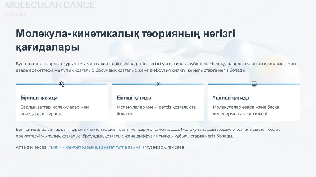 Бұл қағидалар заттардың құрылымы мен қасиеттерін түсіндіруге көмектеседі. Молекулалардың үздіксіз қозғалысы мен өзара