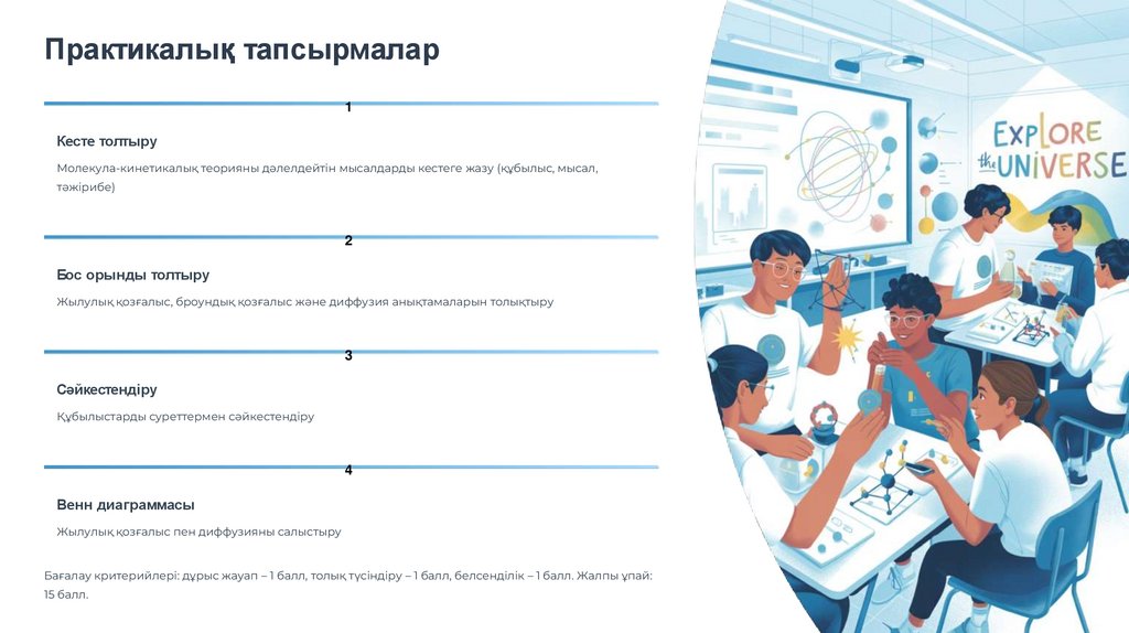 Бағалау критерийлері: дұрыс жауап – 1 балл, толық түсіндіру – 1 балл, белсенділік – 1 балл. Жалпы ұпай: