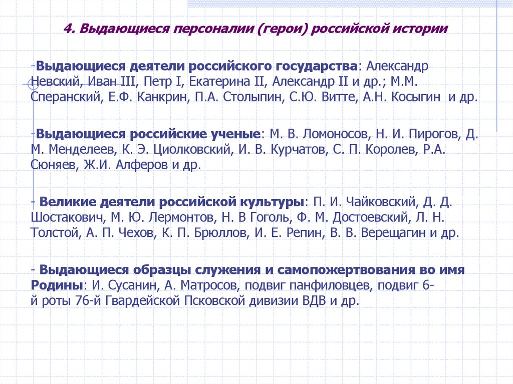 Родины: И. Сусанин, А. Матросов, подвиг панфиловцев, подвиг 6й роты 76-й Гвардейской Псковской дивизии ВДВ и др.