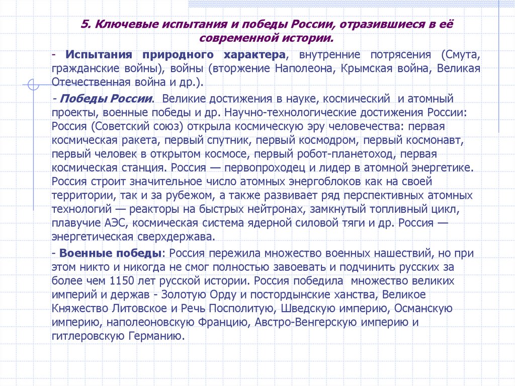 5. Ключевые испытания и победы России, отразившиеся в еёсовременной истории.
