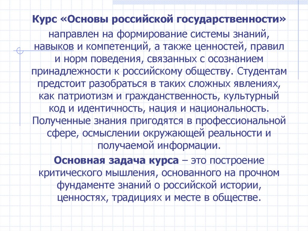 Курс «Основы российской государственности»направлен на формирование системы знаний,