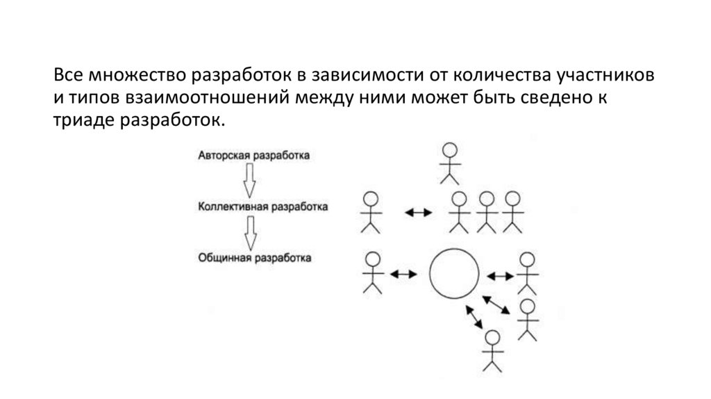 Все множество разработок в зависимости от количества участникови типов взаимоотношений между ними может быть сведено к