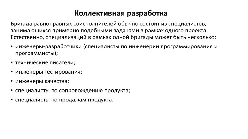 Коллективная разработкаБригада равноправных соисполнителей обычно состоит из специалистов,