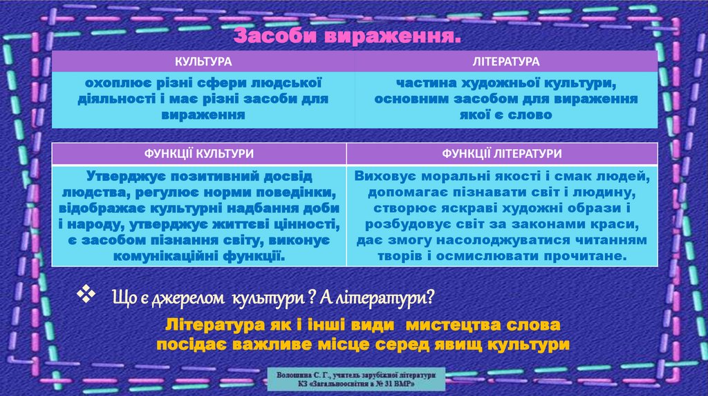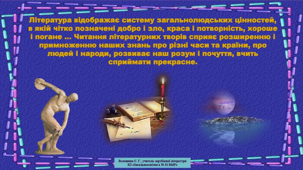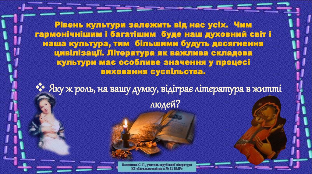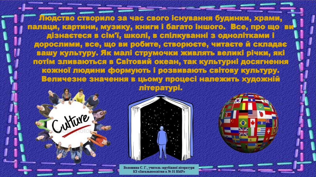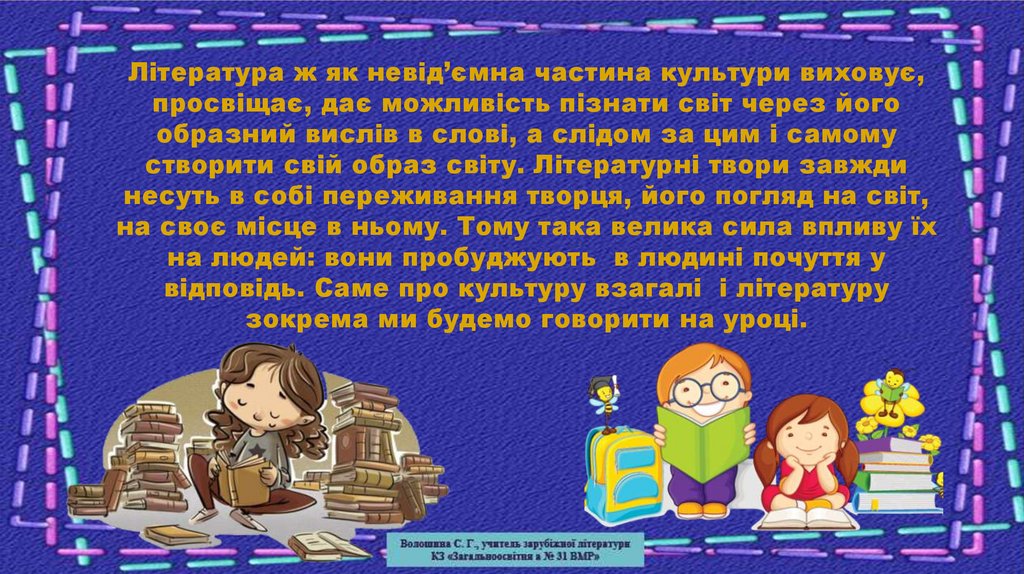 Література ж як невід’ємна частина культури виховує,просвіщає, дає можливість пізнати світ через його