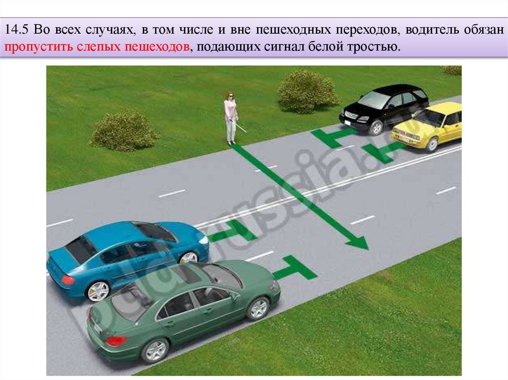 14.5 Во всех случаях, в том числе и вне пешеходных переходов, водитель обязанпропустить слепых пешеходов, подающих сигнал белой тростью.