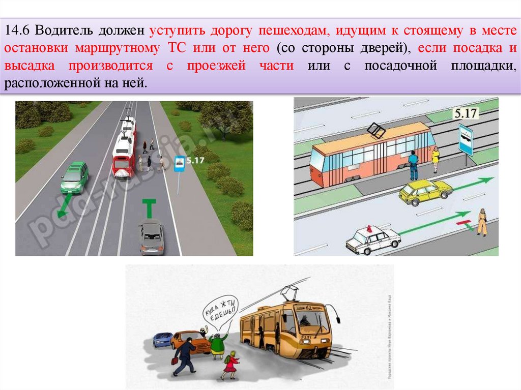 14.6 Водитель должен уступить дорогу пешеходам, идущим к стоящему в местеостановки маршрутному ТС или от него (со стороны дверей), если посадка и