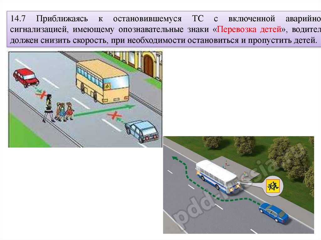 14.7 Приближаясь к остановившемуся ТС с включенной аварийнойсигнализацией, имеющему опознавательные знаки «Перевозка детей», водител