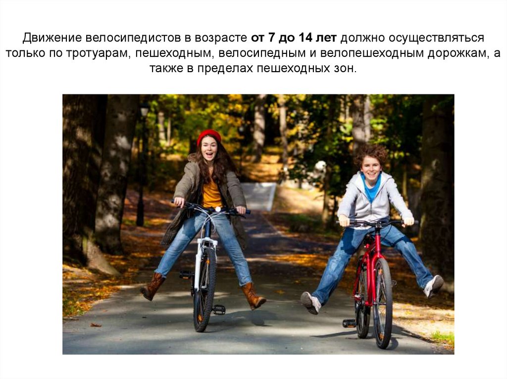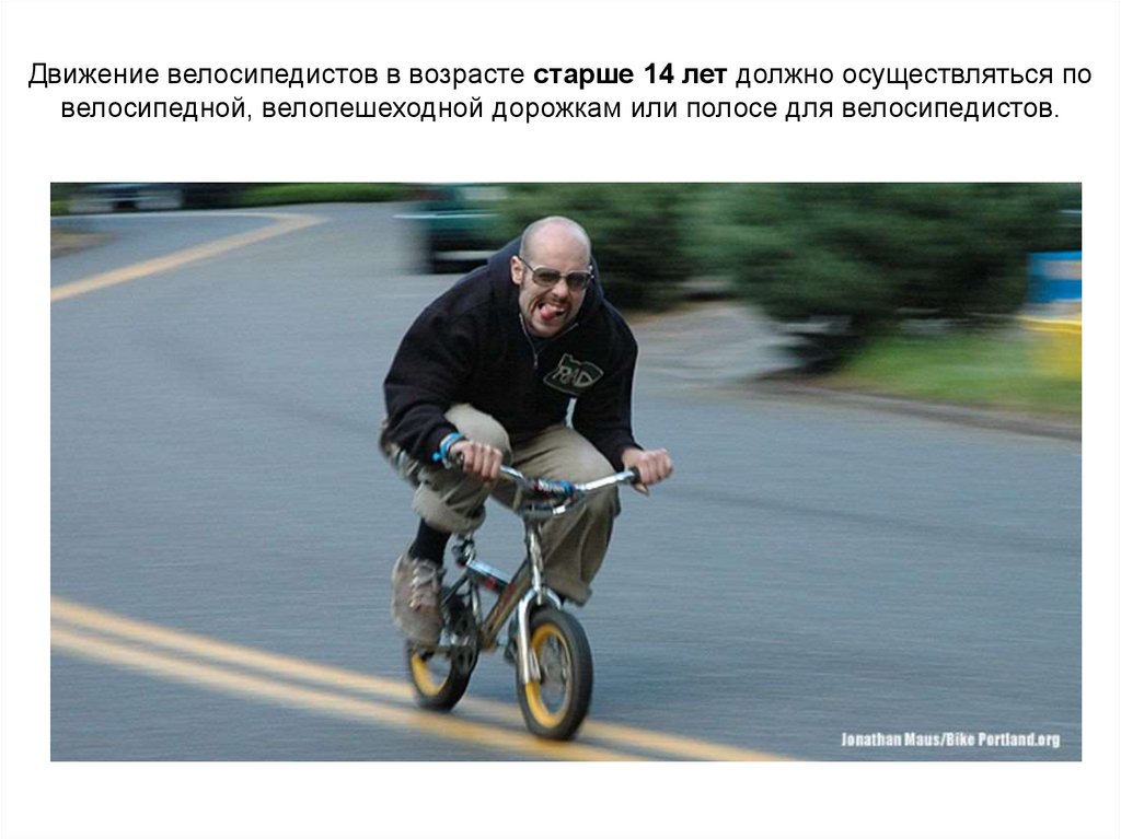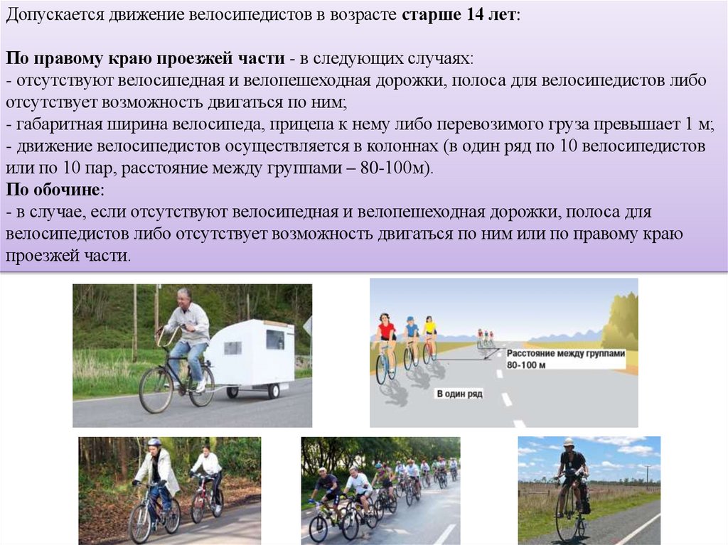 Допускается движение велосипедистов в возрасте старше 14 лет:По правому краю проезжей части - в следующих случаях: