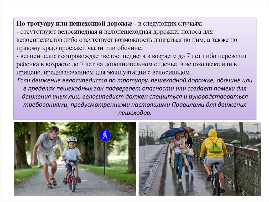 По тротуару или пешеходной дорожке - в следующих случаях:- отсутствуют велосипедная и велопешеходная дорожки, полоса для