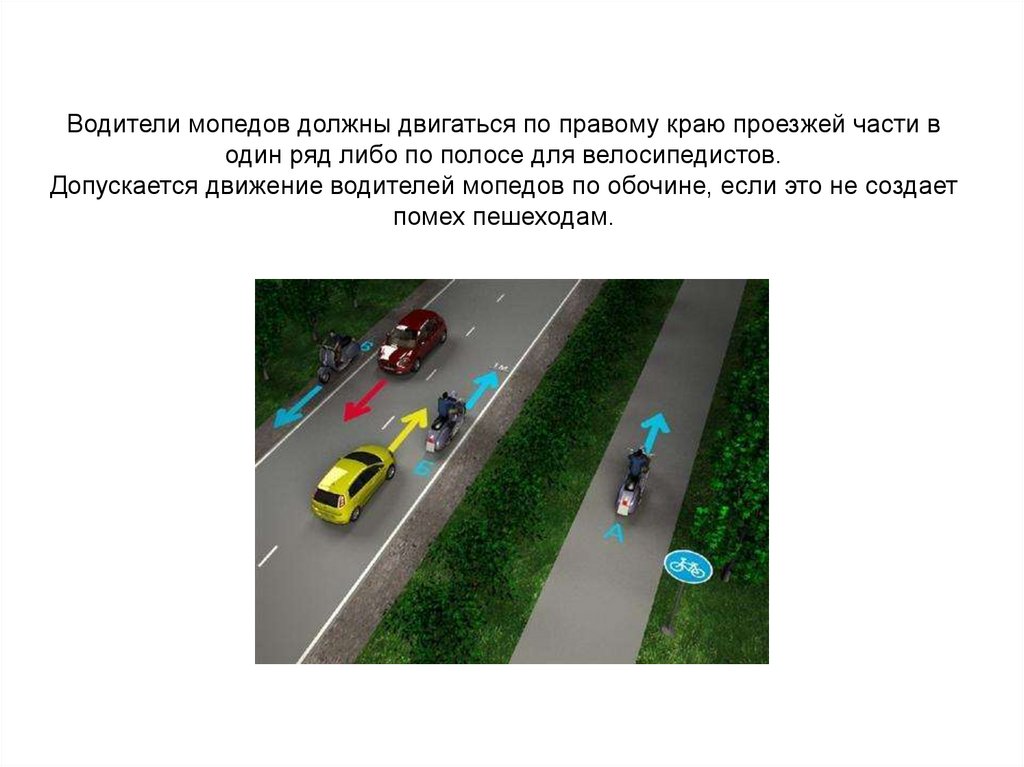 Водители мопедов должны двигаться по правому краю проезжей части водин ряд либо по полосе для велосипедистов.