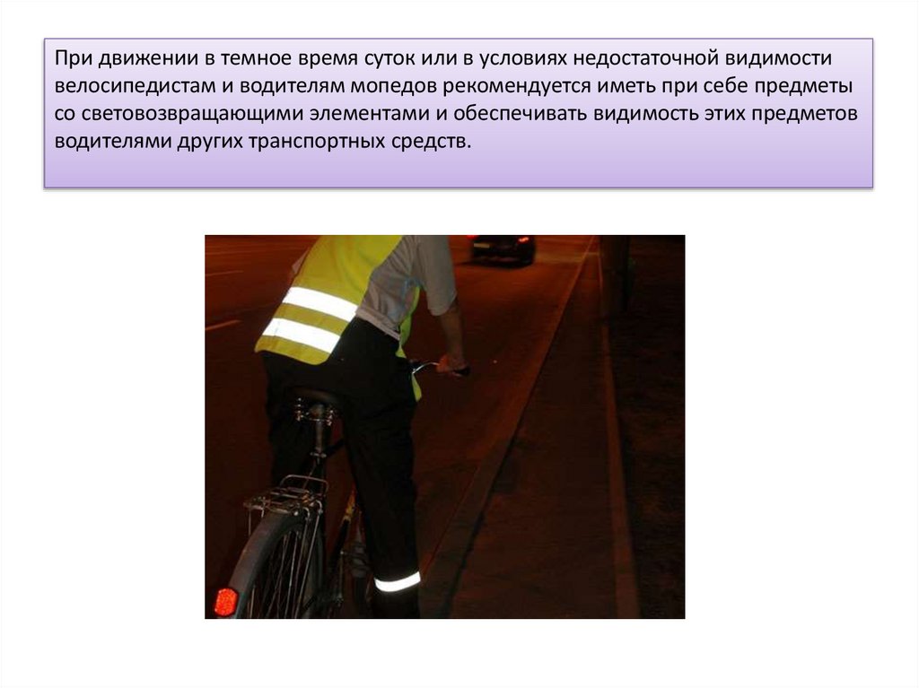 При движении в темное время суток или в условиях недостаточной видимостивелосипедистам и водителям мопедов рекомендуется иметь при себе предметы
