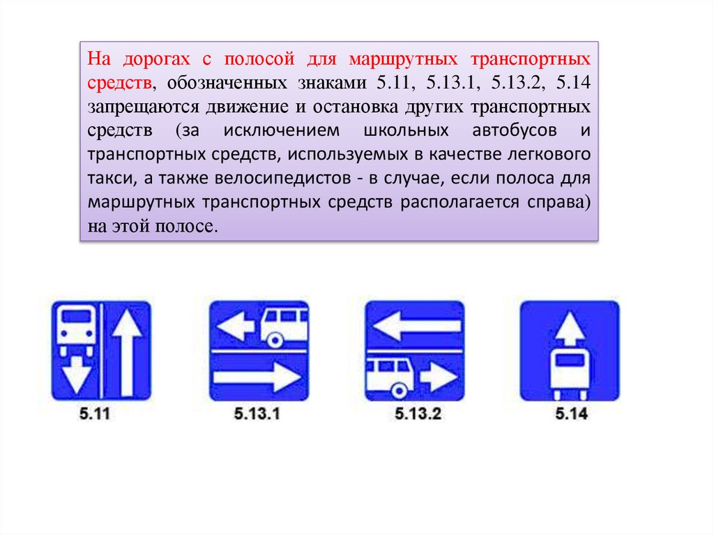 На дорогах с полосой для маршрутных транспортных средств, обозначенныхзнаками 5.11, 5.13.1, 5.13.2, 5.14 запрещаются движение и остановка других