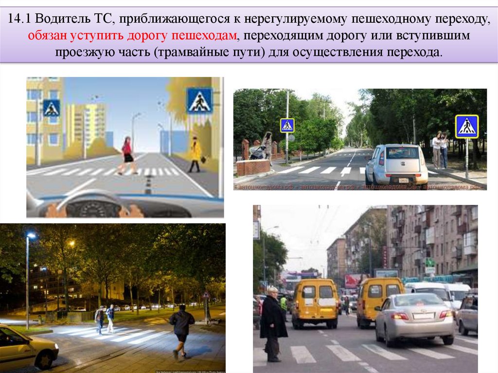 14.1 Водитель ТС, приближающегося к нерегулируемому пешеходному переходу,обязан уступить дорогу пешеходам, переходящим дорогу или вступившим