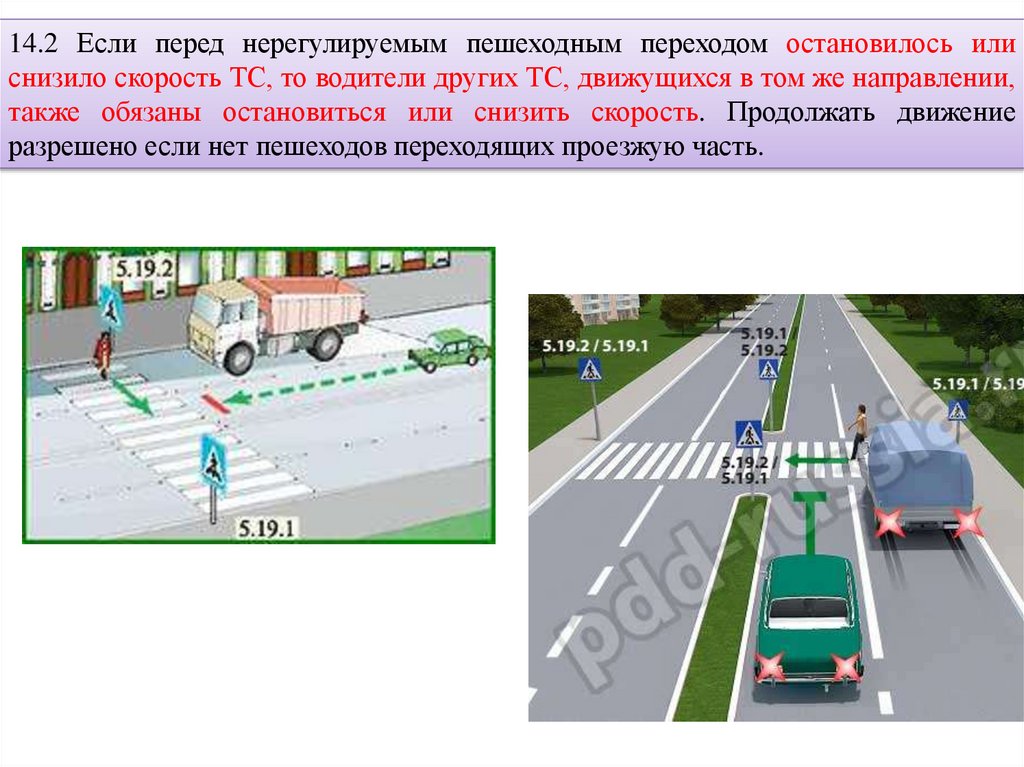 14.2 Если перед нерегулируемым пешеходным переходом остановилось илиснизило скорость ТС, то водители других ТС, движущихся в том же направлении,