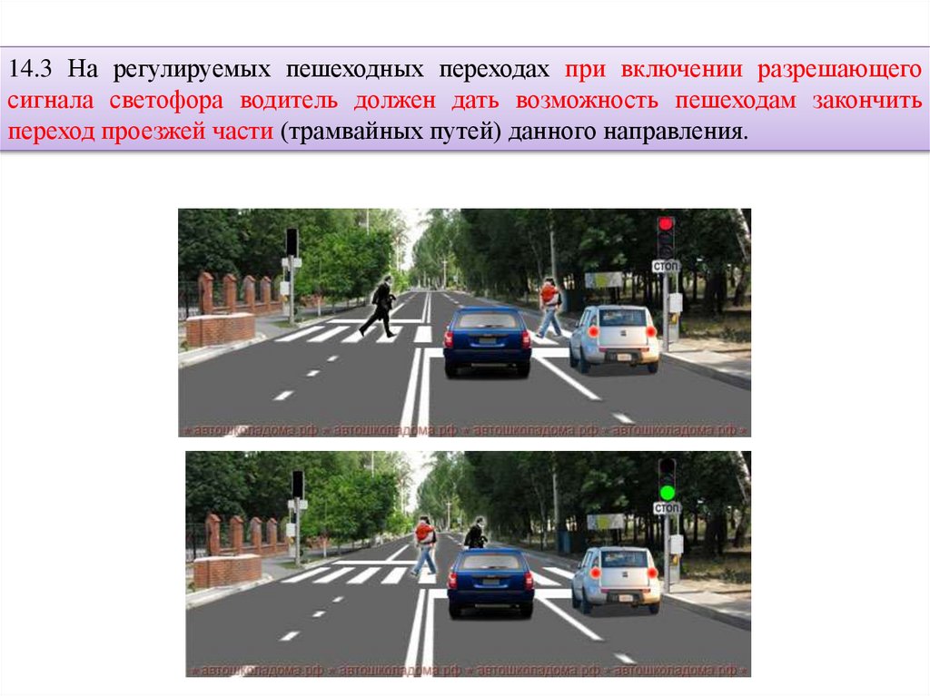 14.3 На регулируемых пешеходных переходах при включении разрешающегосигнала светофора водитель должен дать возможность пешеходам закончить