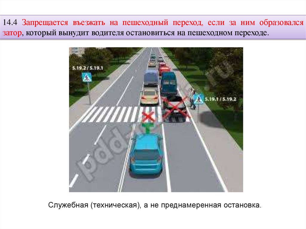 14.4 Запрещается въезжать на пешеходный переход, если за ним образовалсязатор, который вынудит водителя остановиться на пешеходном переходе.