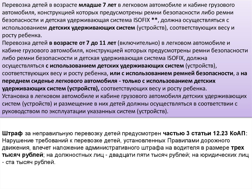 Перевозить детей до 7 лет при отсутствии специальнооборудованных для них мест